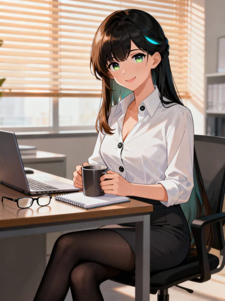 「白シャツのボタンを少しだけ緩めた感じ、黒のタイトスカート、薄い黒タイツ、机に置かれたメガネ…すべてが”落ち着いたお姉さん+できる先輩”に直結してます」