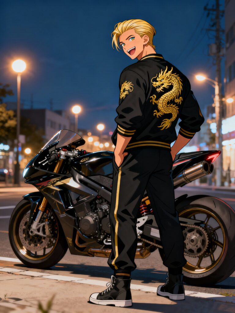 黒ジャージ上下+背中に金の龍刺繍という、非常に象徴的な組み合わせで、「ちょっとヤンチャな不良感」を一瞬でイメージできる衣装になっています。