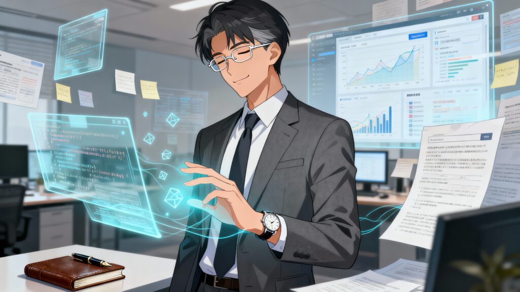 「静かなオフィスにいるのに、どこか只者ではない空気をまとった上司Manusさん」